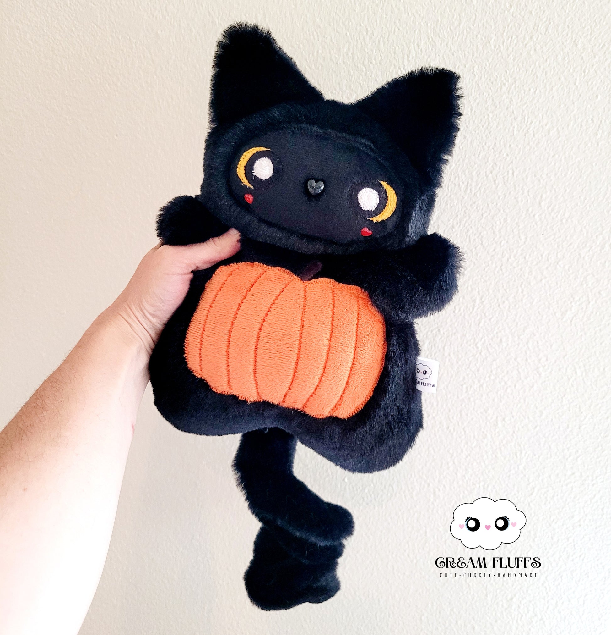 Meet Binx! He's made with luxe cuddle seal caviar and has a sweet orange pumpkin patch on his belly! He's filled with allergy friendly Polyfil and weighted poly pellets. He's a Bitty Cream Fluff at approximately 8".