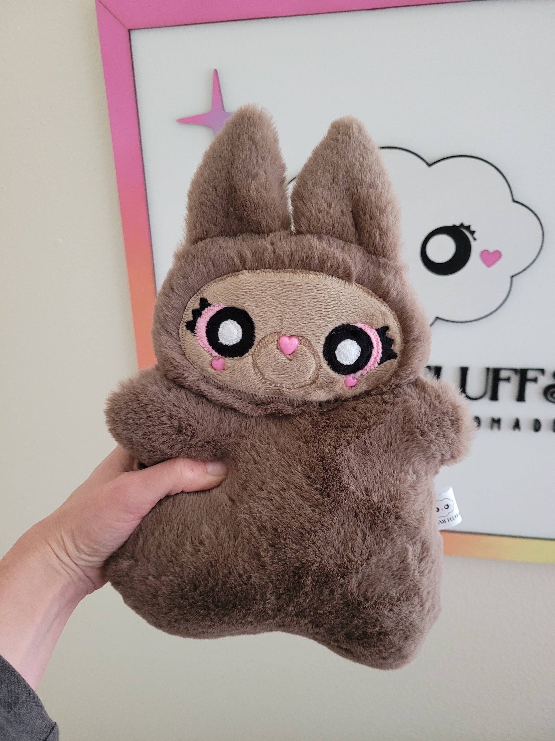 Meet Winston and Willow! They are made with luxe cuddle seal truffle and chocolate. They are filled with allergy friendly Polyfil and weighted poly pellets. They are Bitty sized Cream Fluffs at approximately 8".