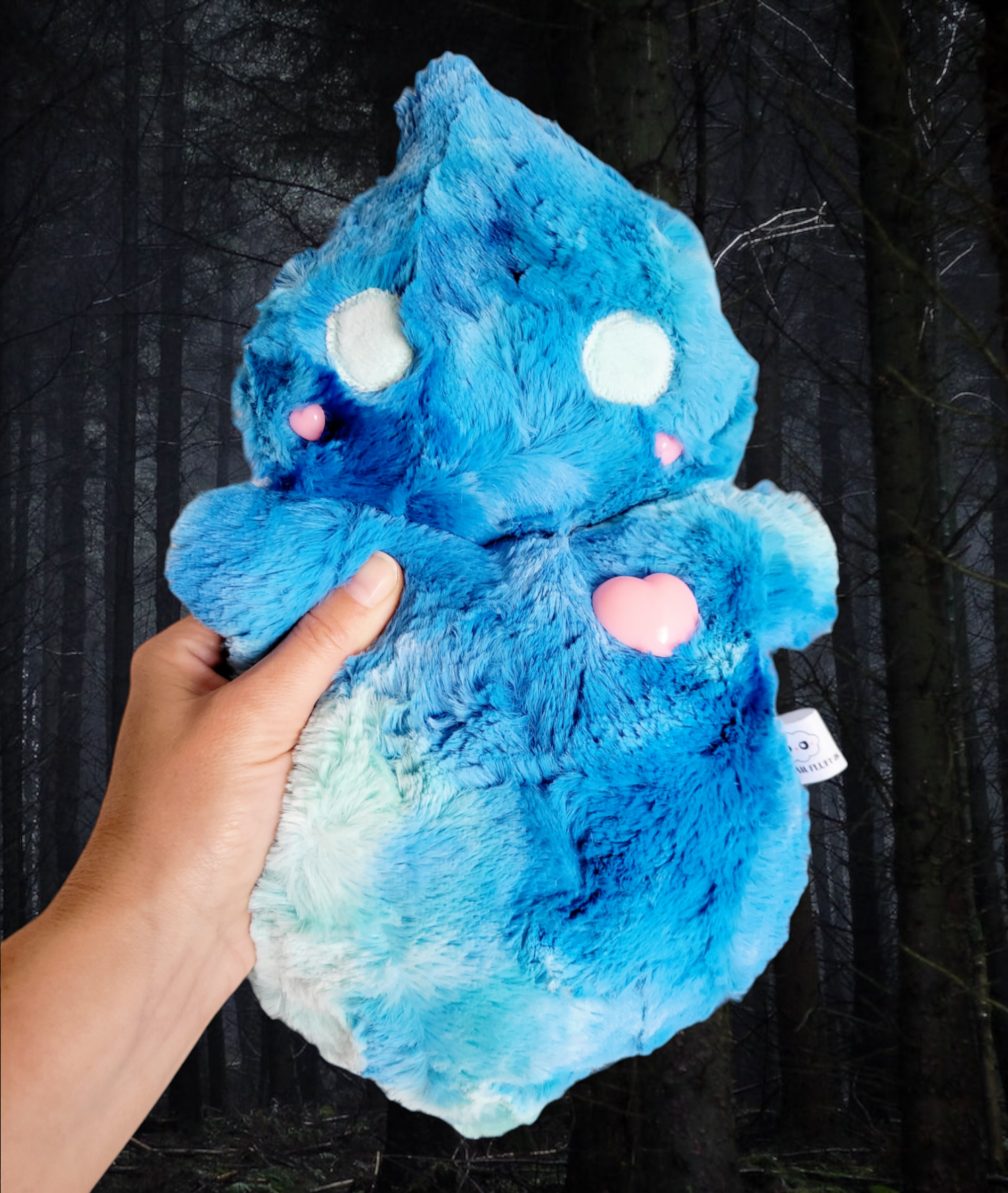 Bitty Wisp is made with luxe cuddle blue glow sorbet and filled with allergy friendly Polyfil and weighted poly pellets. They are bitty Cream Fluffs at approximately 10". 10 oz.