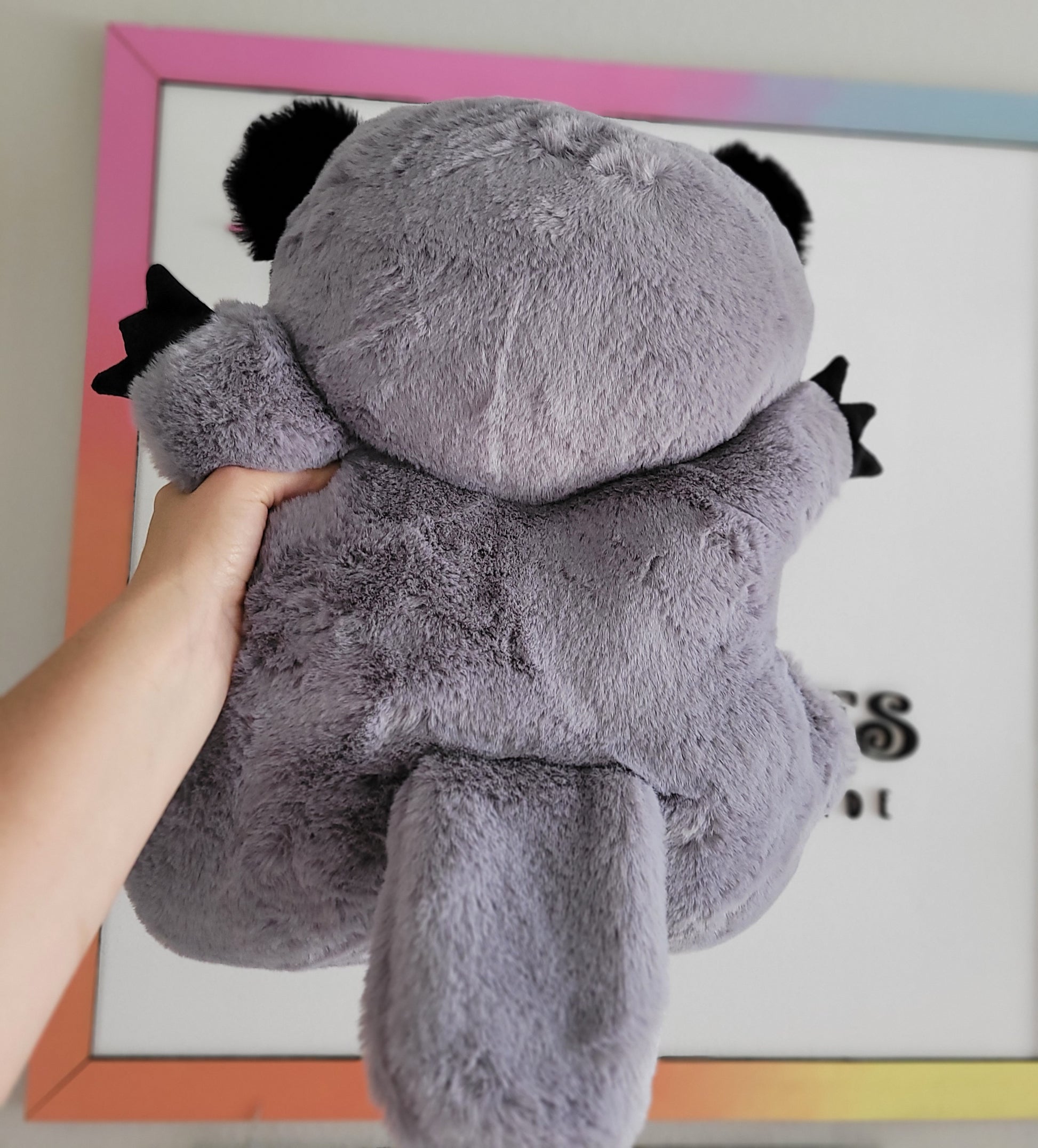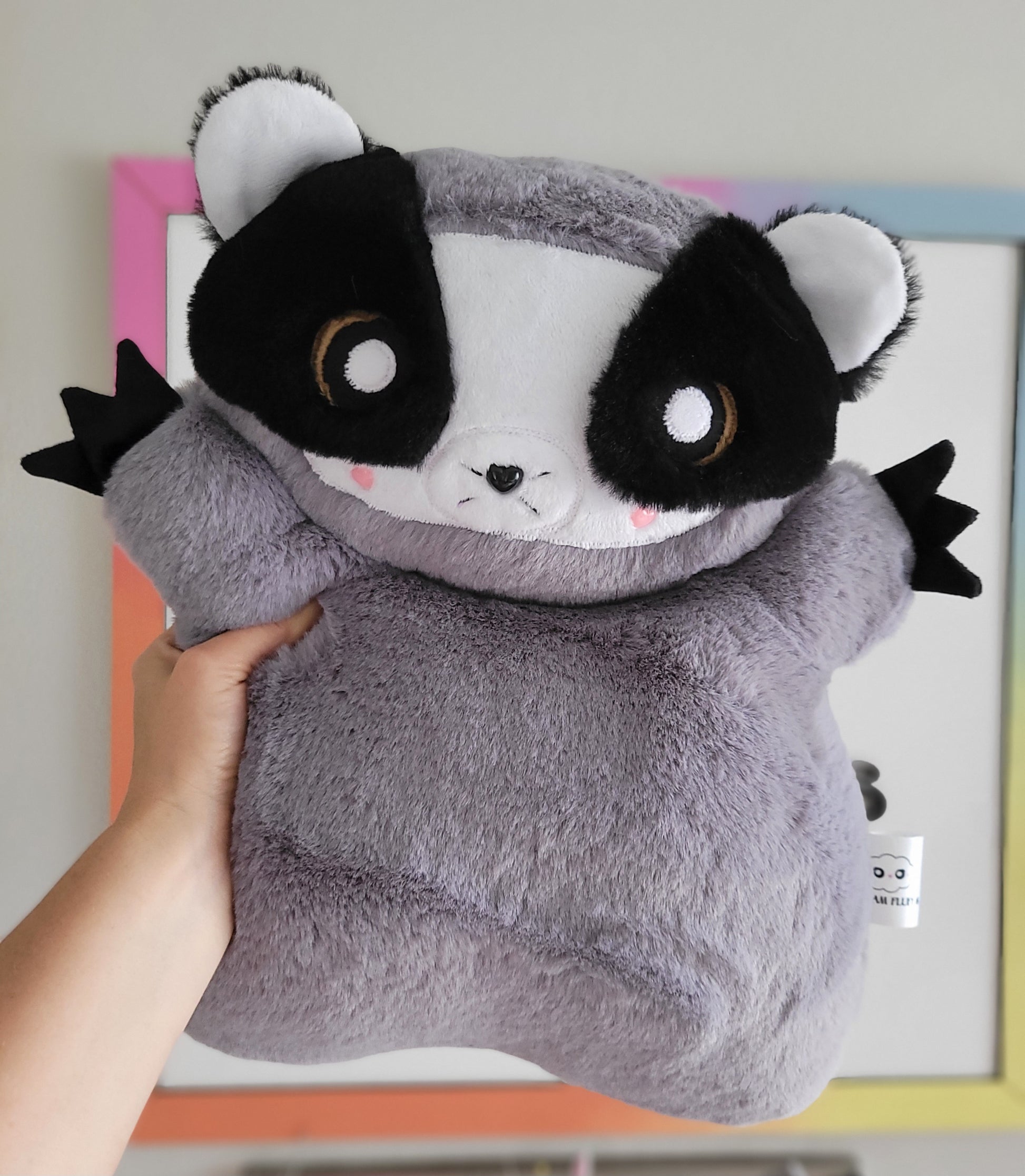 Meet Blaze Badger! He's made with luxe cuddle seal. He's filled with allergy friendly Polyfil and weighted poly pellets. He's a Midi Cream Fluff at approximately 13" and 2lbs.