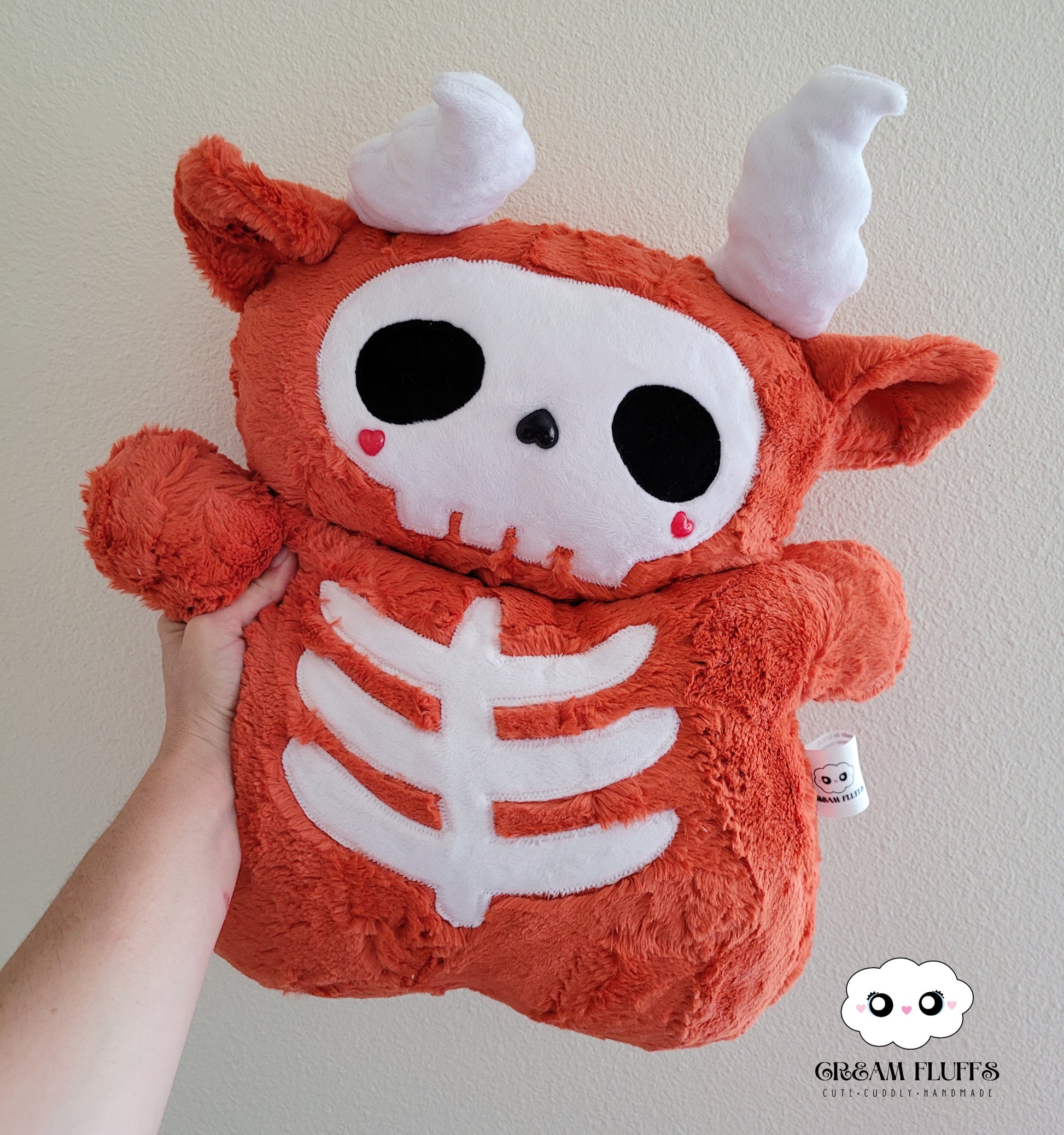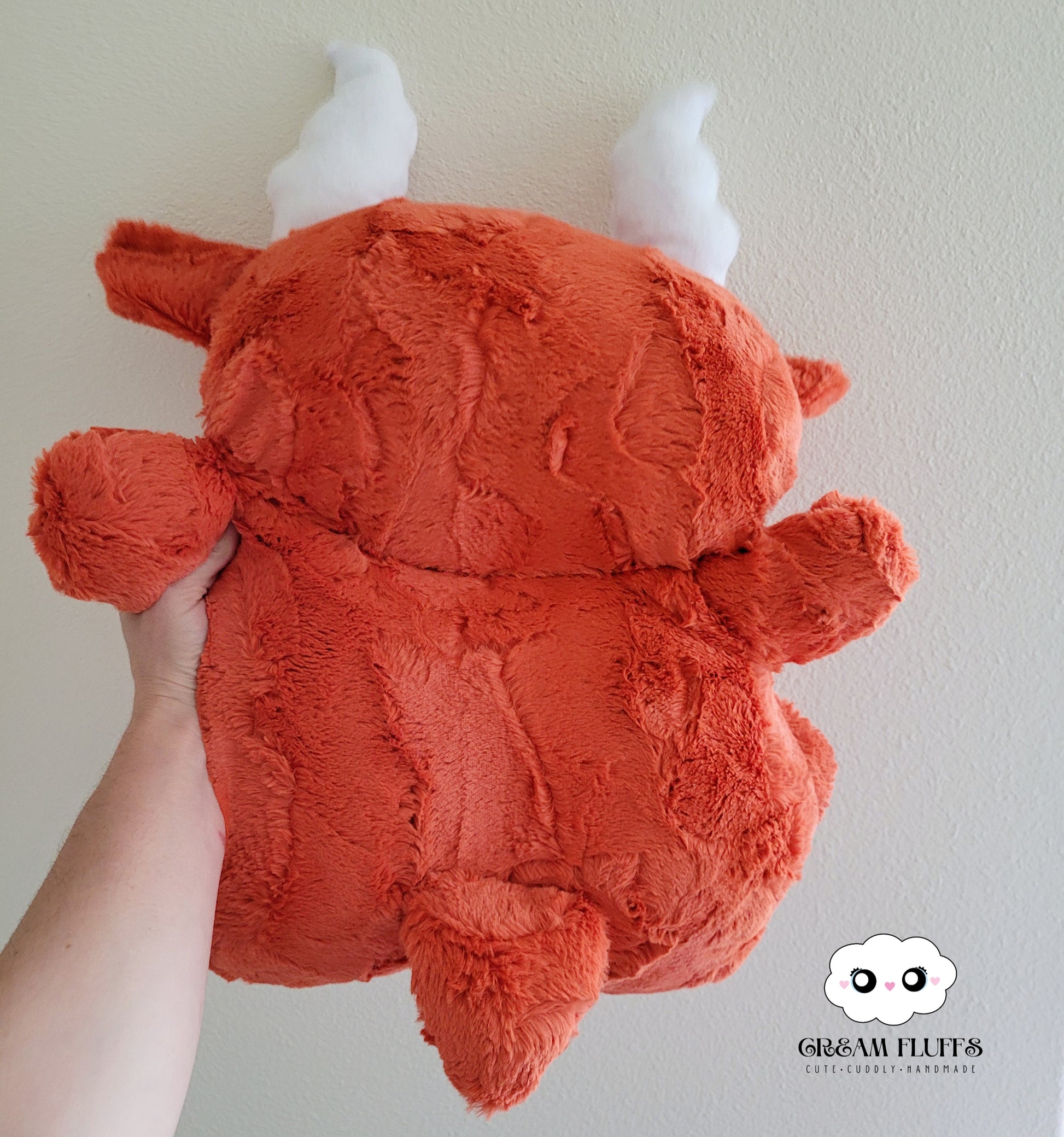 Meet! He's made with luxe cuddle hide mandarin. He's filled with allergy friendly Polyfil and weighted poly pellets. He's a Biggie Cream Fluff at approximately 15".